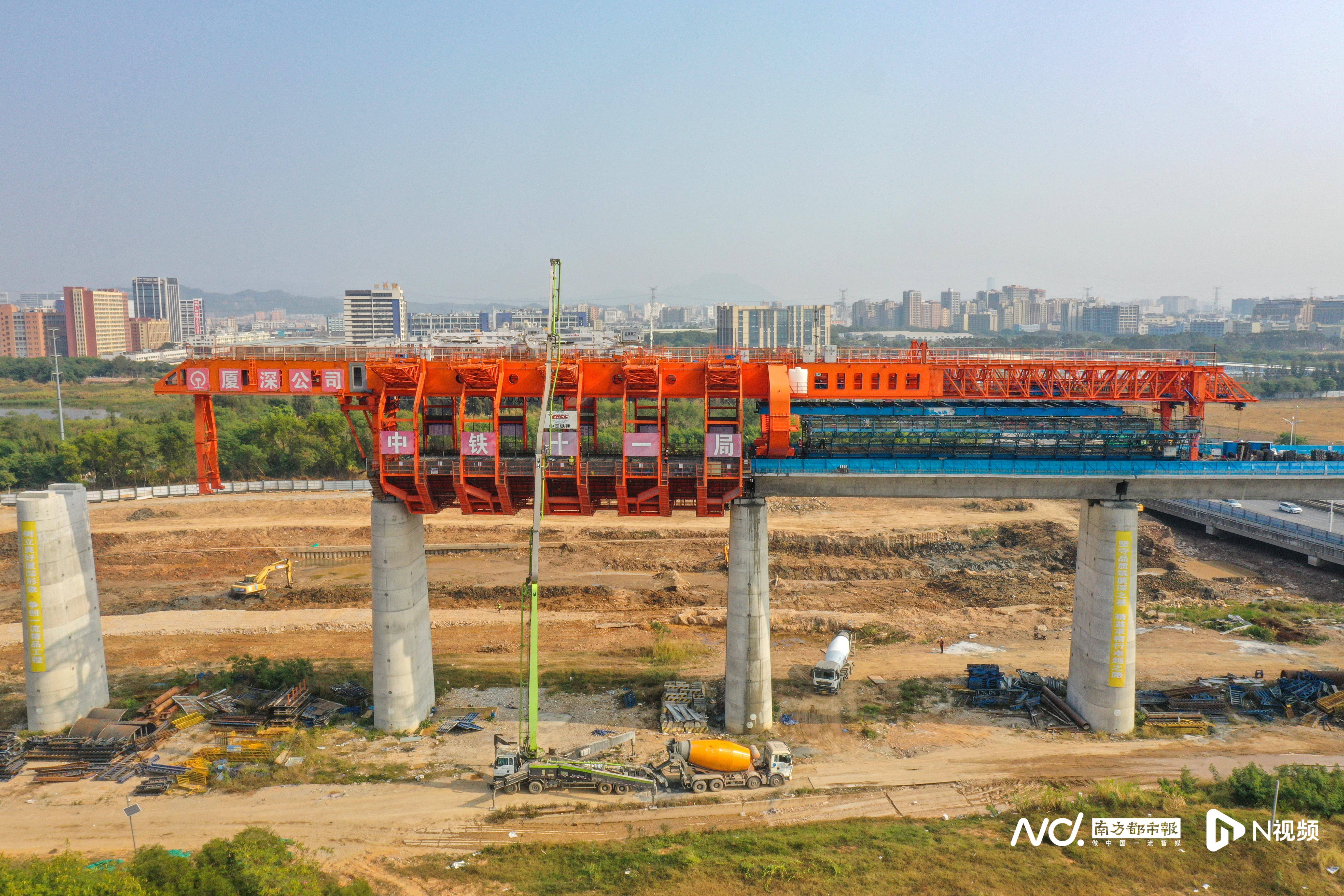 1月28日,中铁十一局承建的深江铁路跨沿江高速特大桥移动模架现浇简支梁施工任务过半,建设有序推进。
